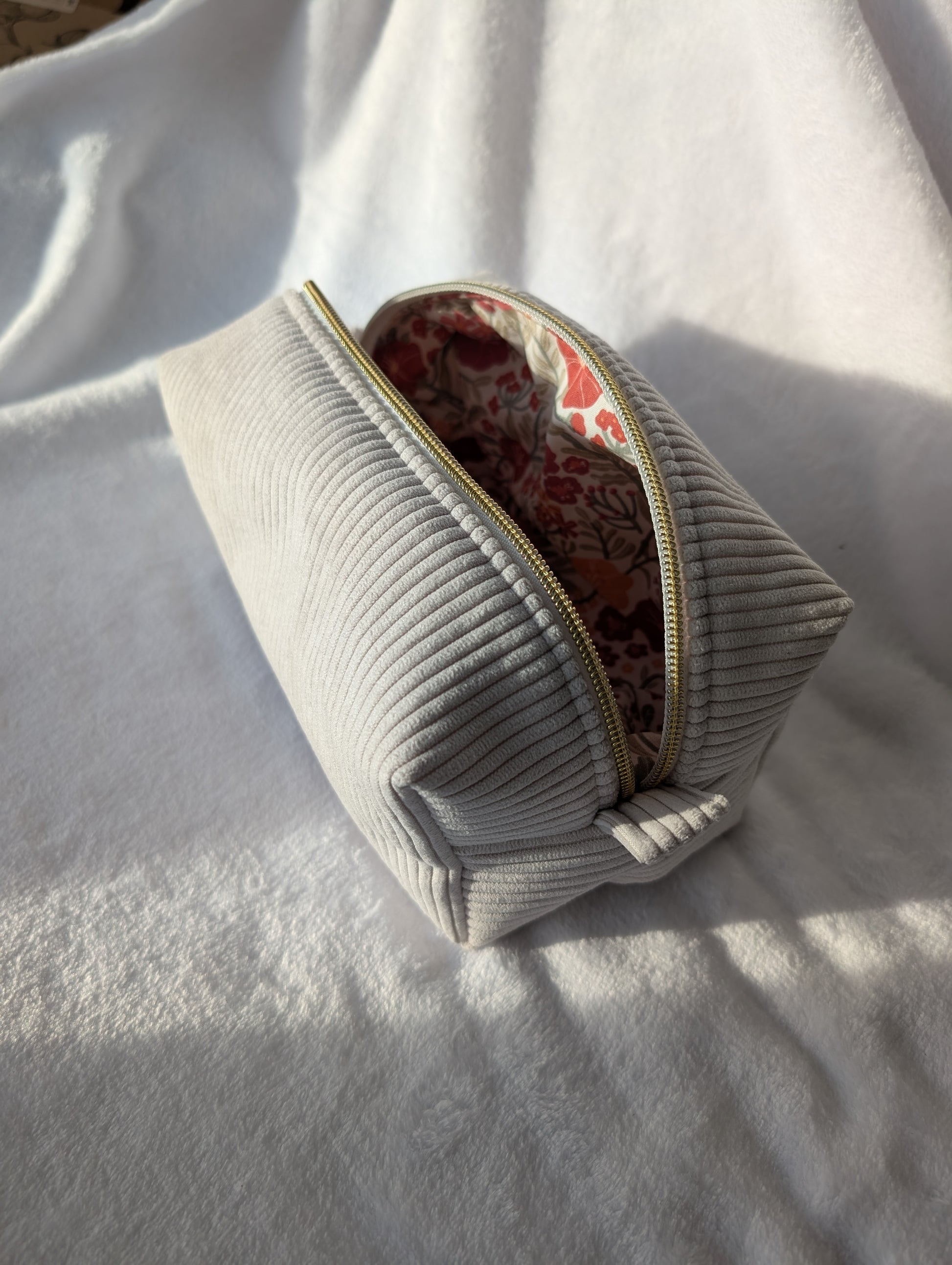 Emmenez cette trousse de toilette en velours côtelé crème et tissu fleuri partout avec vous !